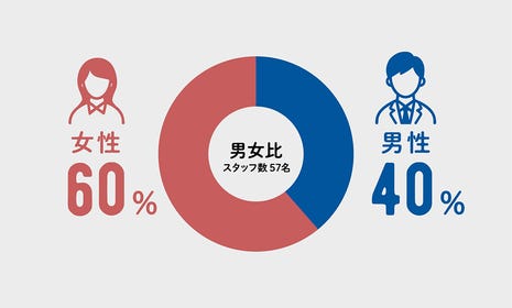 A. スタッフの男女比率は4:6で半分以上が女性スタッフです。 女性スタッフが多いということもあり、社内はとても明るくてあたたかい雰囲気。年齢層も幅広く、同世代はもちろん、先輩後輩関係なく気さくに話せる環境なので、新しく入った方もすぐになじみやすい職場です。結婚や出産など、ライフイベントに対しても理解があり、「お互いさま」の気持ちで支え合えるのが大きな魅力だと思います。キャリア志向のある方には、実力に応じて、リーダーや管理職へのステップアップも可能です。「長く安心して働ける職場を探している」「環境も人も大事にしたい」そんな想いをお持ちの方に、ぴったりの職場です。