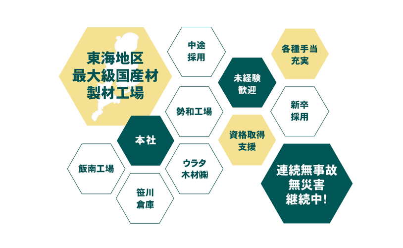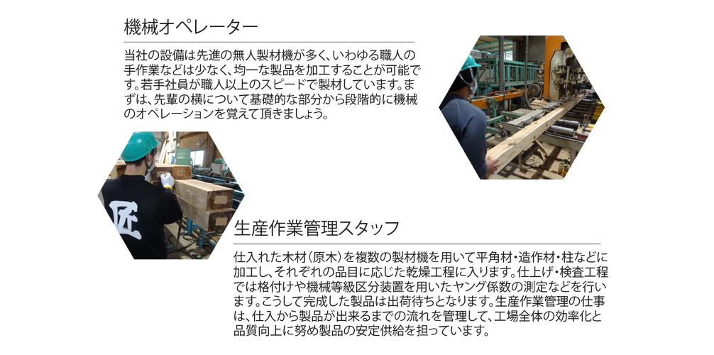 | 事業内容 | 国産の杉・ヒノキ材に特化した製材工場 日本初の木材コンビナートである「ウッドピア松阪」内にあります。 ➀東海地区トップクラスの生産量を誇る木材製材工場 ➁JAS認定工場、県産材認定工場 (3)少量・大量ロットのタイムリーの受注生産 (構造材・内装材・羽柄材)住宅一棟分の出荷可能 (4)一本ごと機械による強度計算を実施(構造材) (三重県では他に2社のみ) (5)ゴミが出ない工場体制、丸太を使い切る CO2削減に貢献(原木皮や端切れやチップやボイラーで乾燥機の燃料) |