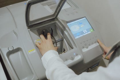 お客様からご注文をいただいたレンズを加工し、フレームに入れられる枠入れ加工をします。ほとんどの加工作業は機械で行います。