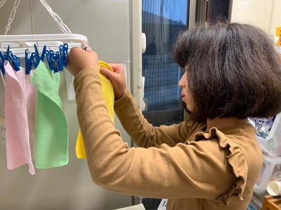 台ふきんを干すのをお手伝いしています