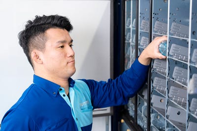 私たちの会社には複数の職種がありますが、「ルートセールス」がその中心になってきます。自動販売機の設置先を巡回し、商品の補充、機械の清掃、売上金の回収などを行う仕事ですが、季節や設置場所の環境などお客さまのニーズを汲み取り、商品をラインナップしていくマーケティングの要素もある仕事です。