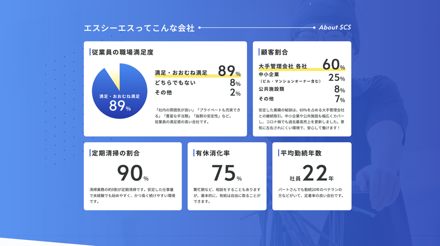 正社員として勤務して11年になります。勤務先を選ぶのにあたって、ライフワークバランスをとても重視していて、ここエスシーエスは定期清掃が多いので、勤務時間が安定していて、深夜に及ぶ作業も無い点がとても自分に合っています。スタッフ皆、人柄もよく働きやすい環境です。