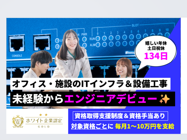 ■スタート給与 ・未経験の方:月額27万円~ ∟これまでのご経験やスキルに応じて、加給・優遇あり ※別途資格手当あり:対象資格ごとに毎月1~10万円を支給 ※資格取得支援制度:入社後の資格取得にかかる費用は全額会社負担