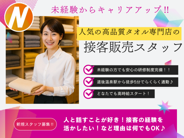 人気の高品質タオル専門店で、お客様に優しいライフスタイルに合わせた接客販売をお願い致します。