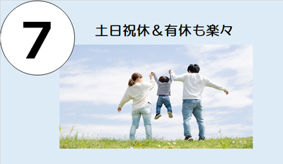 カレンダー通りにきっちり休めて、長期休暇もあり。有給休暇は希望通りに取得してOKです。実際、社員の多くは8割以上消化しています。趣味の時間、家族と過ごす時間など、プライベートもたっぷり楽しんでください。