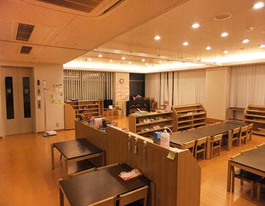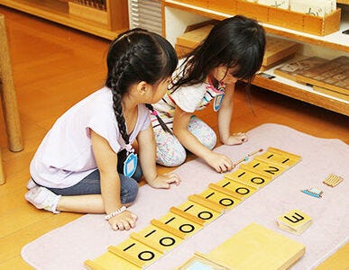 保育室は、空へつながる開放感と、木のぬくもりに満ちています。子ども達は思い思いに、教具を選んでは机に運び、それに集中しています。落ち着いた環境が、それを可能にしています。