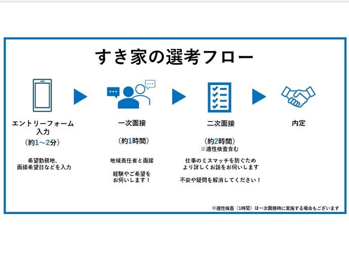 店舗状態管理、オペレーション、防犯対策などを点数化し、4段階ステップアップできます。1つアップすると月給が5000円アップ。試験は3か月ごとで、試験内容はどのランクも同じ。決められた点数を達成することでランクアップします。ランクが上がるごとに自分の成長も実感できるでしょう。