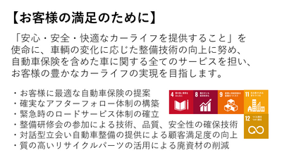 | 事業内容 | ◎当社は「安心・安全・快適なカーライフを提供すること」を使命としています。 ◎車両部は車に関するすべてのサービスを担い、お客様の豊かなカーライフの実現を目指しています。 ◎運送部は安全意識・運転技術の向上により事故ゼロの達成と、周辺環境に配慮した事業を行い、お客様から必要とされる会社を目指しています。 ◎SDGs宣言企業として「お客様の満足のため」「安全に走り続けるため」「従業員の幸福のため」「地域に貢献するため」の4本柱を目標に、会社と従業員の目標設定を明確にし、働きやすい職場環境の実現と地域に信頼される会社を目指しています。 ■自動車整備・車検・定期点検・板金塗装 ■大型ダンプによる運送業 ■自動車販売業(新車・中古車) ■レンタカー事業 ■ロードサービス ■自動車保険販売業 |