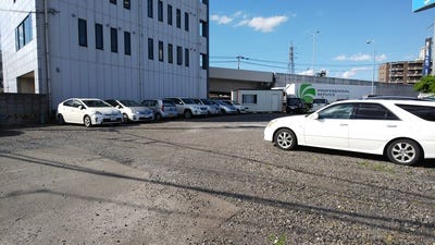 ビルの隣の広い砂利の敷地が駐車場です