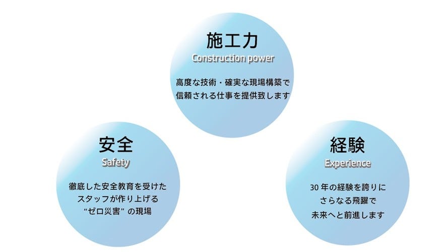 請負業という立場から現場の成功を目指し、笑顔の行き届いた現場の完了を常に心がけます。