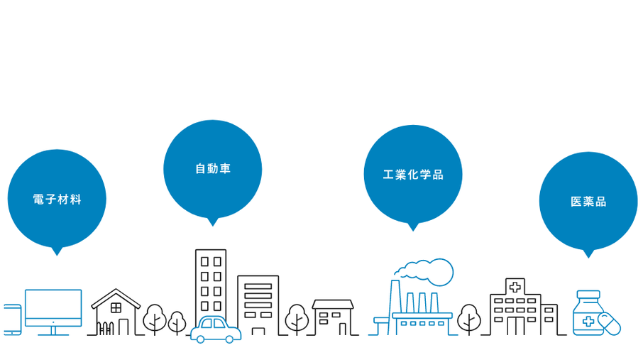 高度な技術力、最新の設備を導入し、大手企業を含めたくさんの案件のご依頼をいただいています。当社が製造を手掛けるものは、スマホや医薬品、半導体や自動車などにも使われるファインケミカル。今後もニーズが絶えない製品です。