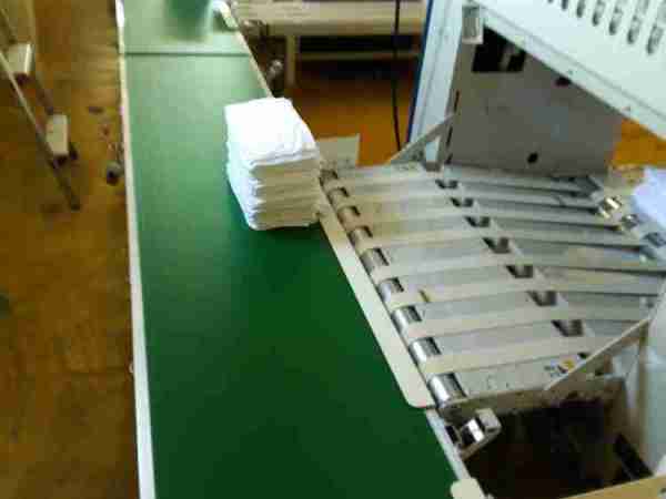 たたまれたタオルがベルトコンベアーに乗って結束機へと運ばれて行きます。
