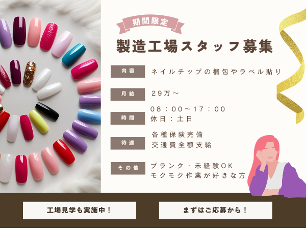 ネイルチップの製造工場での作業となります。