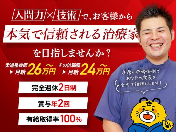 | 事業内容 | 「人」の喜びを一生懸命に追求 セラピストパークでは、“元気+笑顔=健康”という理念に基づき、患者様だけでなく、共に働くスタッフやその家族、関わるすべての人の「喜び」を大切にしています。 また、一人ひとりが本気で人と向き合い、技術力だけでなく心のあり方でも信頼される― そんな“人のプロフェッショナル”として成長できる場所を目指しています。 |