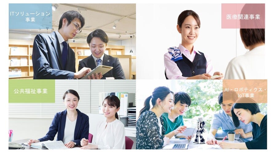 | 事業内容 | ITソリューション・メディカルサポート・公共福祉事務と、新たにAI・ロボティクス事業が4つ目の事業として展開をスタートしました。創立から半世紀を超え、社員数も4,800名以上となりました。経営理念の「遊々精励」を基に、仕事はもちろん遊びにも全力で取り組むワークライフバランスを大切にする会社です。 |
