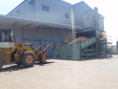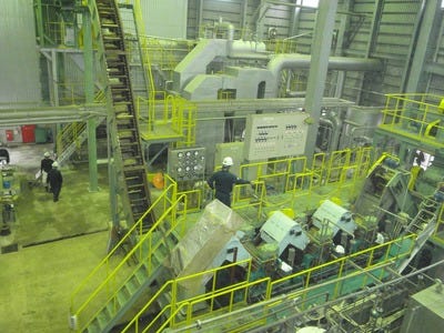 そして、左奥のコンベアで、ボイラーへとカスが運ばれます。