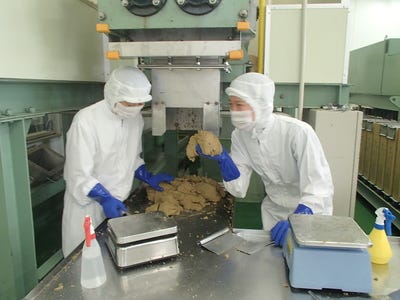 出てきた黒糖は、餅のように柔らかく、30kgの製品箱へ入れたのち、突いて成形を行います。