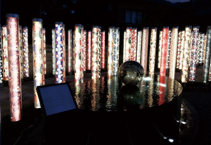 2013年7月京都・嵐山駅にキモノフォレスト「友禅の光林」として2mの丸い柱が立ち並び、その中にGLORYのバーランプが採用されてます。