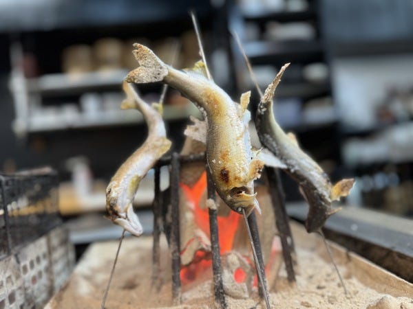 オープンキッチンカウンターから見える囲炉裏で全国から届く美味しいお魚やお肉を焼き上げます。