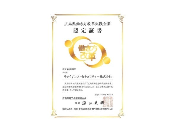 広島県の警備会社約300社中唯一「広島県働き方改革実践企業」の認定