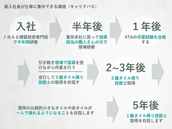 最初の半年間は、タイル工事についてゼロから学べる研修期間です。