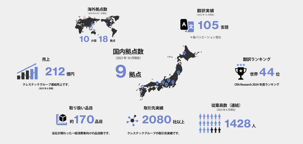 | 事業内容 | クレステックグループは、情報に“カタチ”を与える仕事をしています。 そのメイン業務の1つがマニュアル制作です。お客様である企業が製品に添付する取扱説明書ならびに整備士向けの修理マニュアル等のライティングから、イラスト作成、印刷用データ制作、翻訳、印刷等のドキュメンテーション作成に関わる業務を中心に行っております。 ドキュメントの制作に開発段階から係わり、ドキュメントを読んだ使用者が分かりやすくかつ安全に製品の操作ができるよう、専門的な技術情報をわかりやすく表現し、最終提供形態であるデータもしくは印刷物等の形あるものに変える創造性の高い業務を行っております。 また、お客様の製品を正しく、深く理解することを得意としている特性から、製品/サービスのプロモーションや社員教育など、製品がリリースされた後のサポートも実施。動画、Webサイト、カタログなど多様な媒体の制作も行っています。 |
