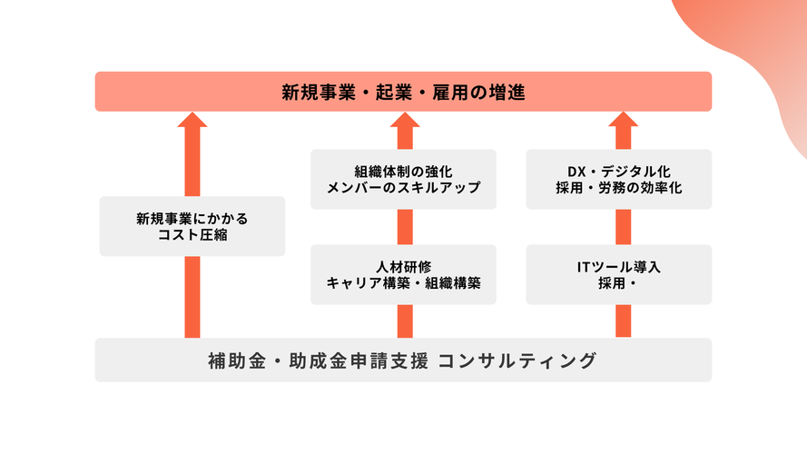 | 事業内容 | ・クライアントの挑戦を支援する、伴走支援型のコンサルティング ・設備投資や新規事業展開のための補助金の活用や、社内の人材育成や研修に関する助成金の申請支援 ・DX化による生産性向上や、社内の制度づくりをはじめとした組織構築 |