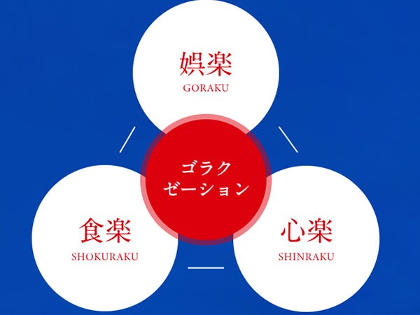「娯楽」と「リラクゼーション」を掛け合わせ「ゴラクゼーション」というキーワードを掲げ、飲食事業や温泉事業など様々な事業展開を目指しています。