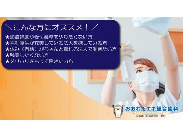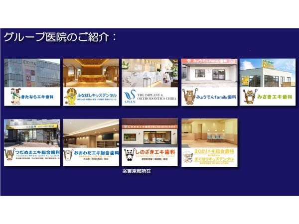 | 事業内容 | 【法人について】 東京、千葉を中心に全国に歯科医院を展開する医療法人です。 (その他 愛知、兵庫、神奈川、石川、福井、富山) ●千葉グループ医院一覧● ~千葉県千葉市~ ・まくはりエキ総合歯科 ~千葉県船橋市~ ・きたならエキ歯科 ・みさきエキ歯科 ・ふなばしキッズデンタル ・THE IMPLANT & ORTHODONTICS CHIBA ~千葉県習志野市~ ・つだぬまエキ総合歯科 ~千葉県市川市~ ・みょうでんfamily歯科 ・みょうでんキッズデンタル ~千葉県松戸市~ ・ときわ平エキ総合歯科 ~東京都江戸川区~ ・しのざきエキ歯科 ・かさいエキ総合歯科 ~千葉県八千代市~ ・おおわだエキ総合歯科 ・やちよ中央エキ総合歯科 ~兵庫県神戸市~ ・もとやまエキ歯科 |