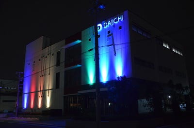 パチンコ業界だけにとどまらず、新しい開発を常にこころがけています。本社外壁を彩る照明は、自社開発の輝照(きてら)です。