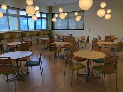 カフェ風なおしゃれな休憩室が自慢です。お昼時にはお弁当を食べたり、コーヒーを飲んだり、コミュニケーションの場として利用されています。