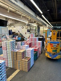 まず、前日に競り落とした商品を倉庫から品出し・運搬して市場内の店頭に並べ、商品を販売します。